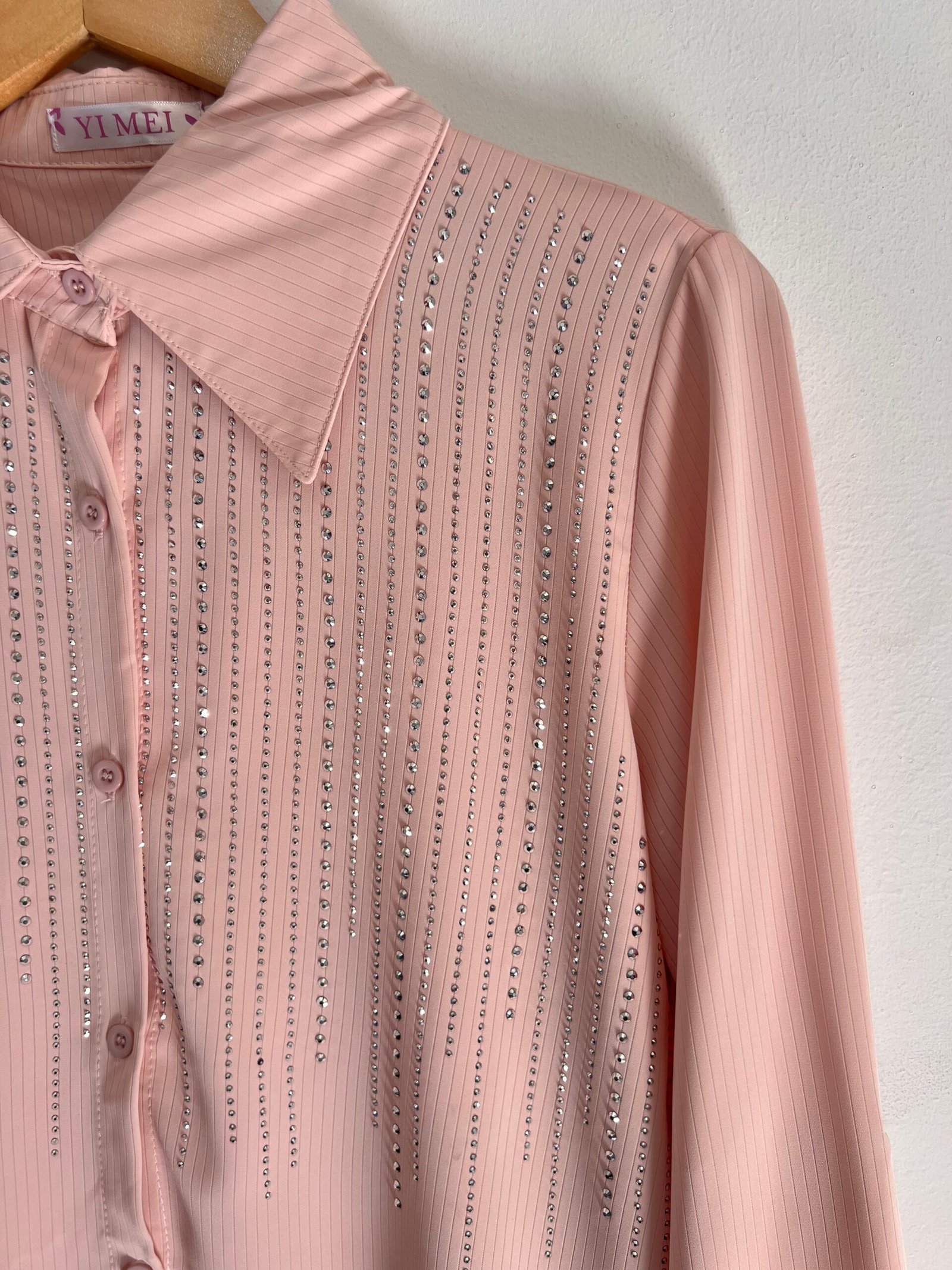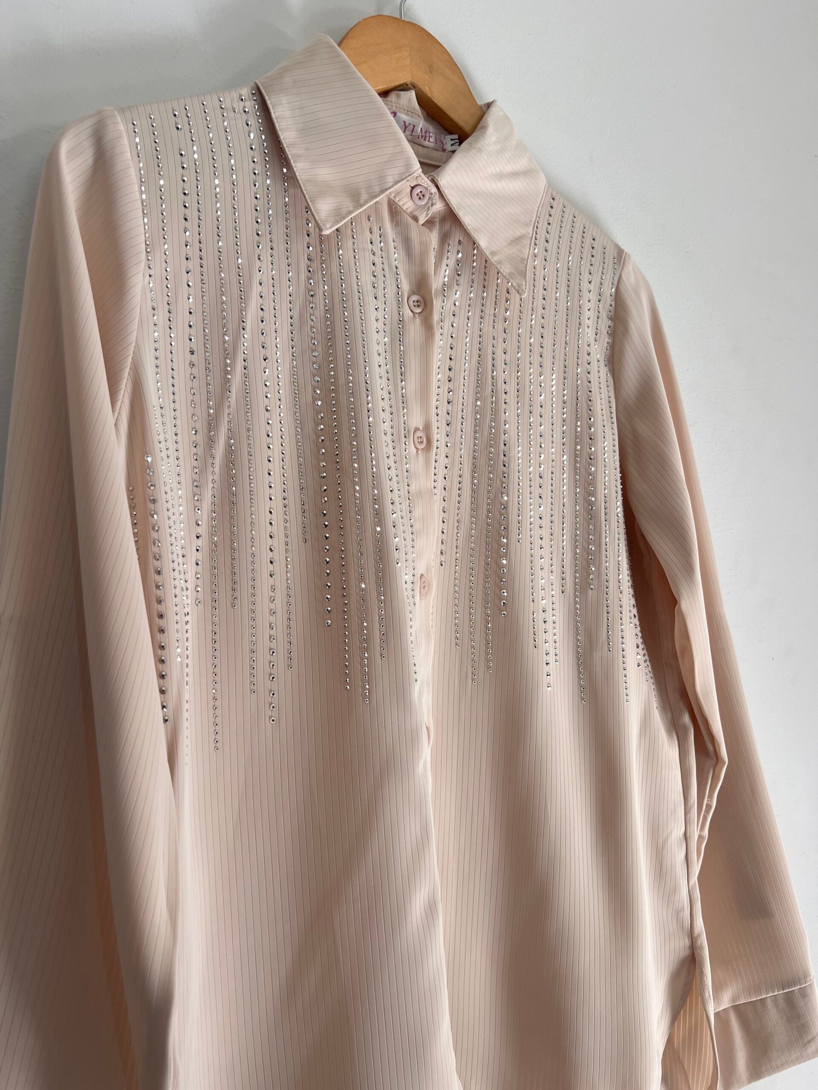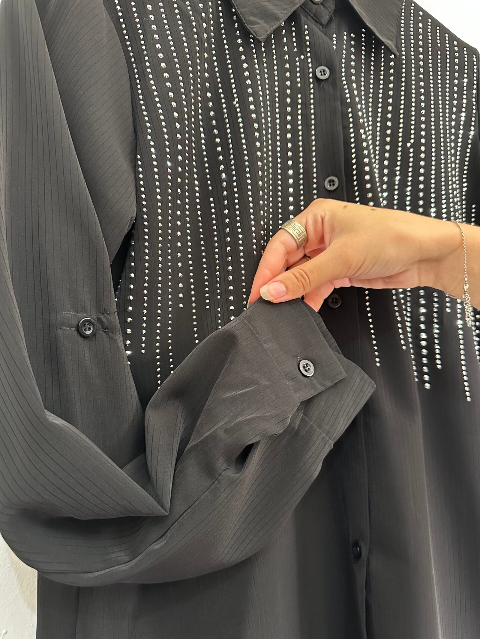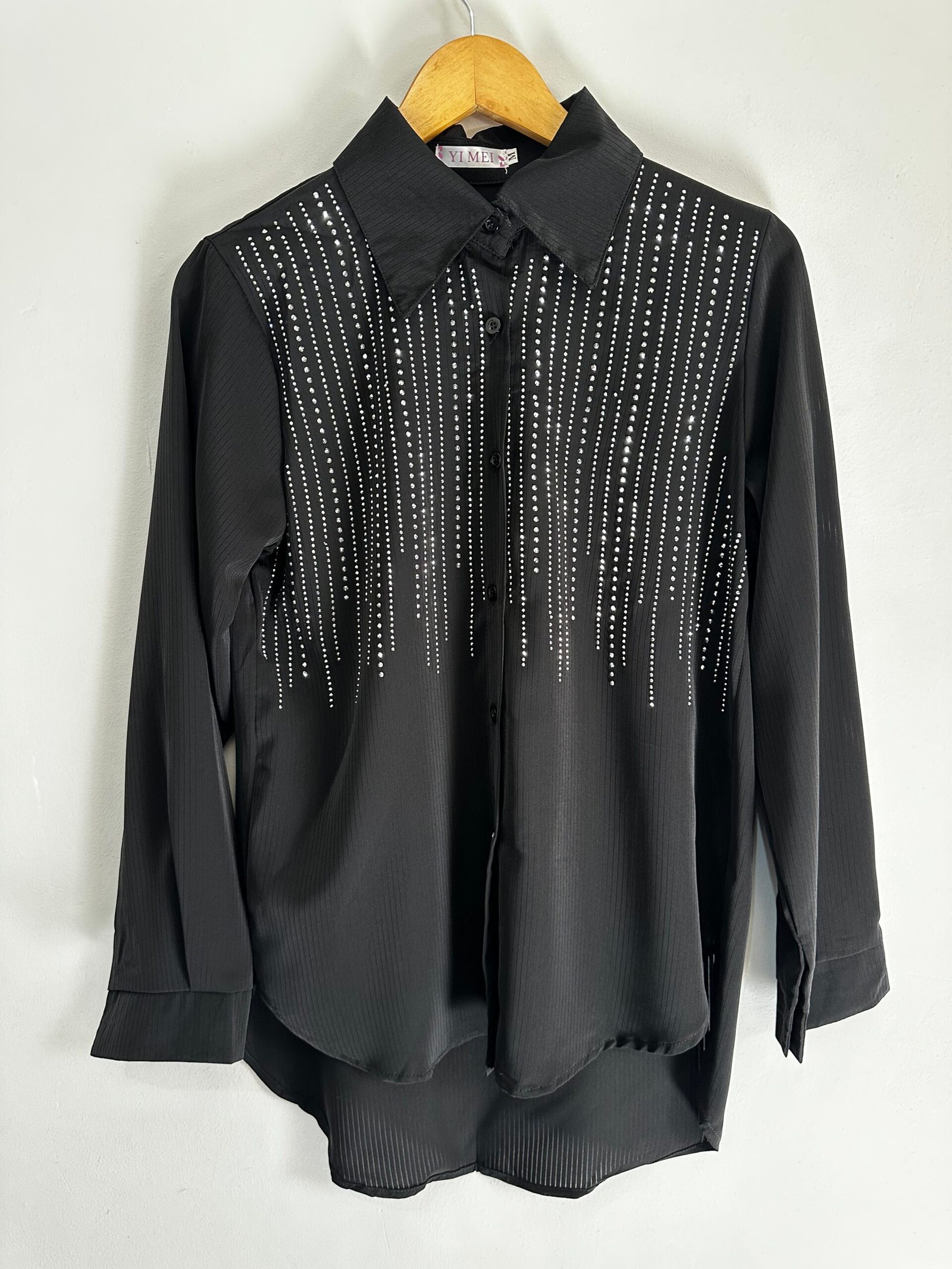 Camisa con detalles de strass en caída que le dan ese toque chic y diferente. Súper versátil, úsala de día o de noche y vas a destacar. Talle M, L y XL. 🤩