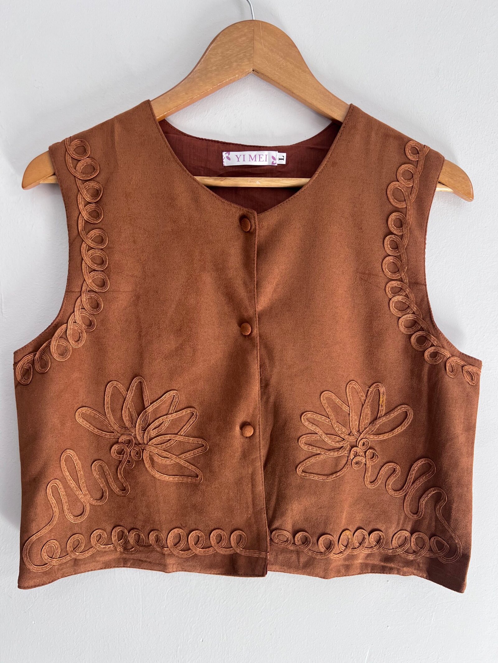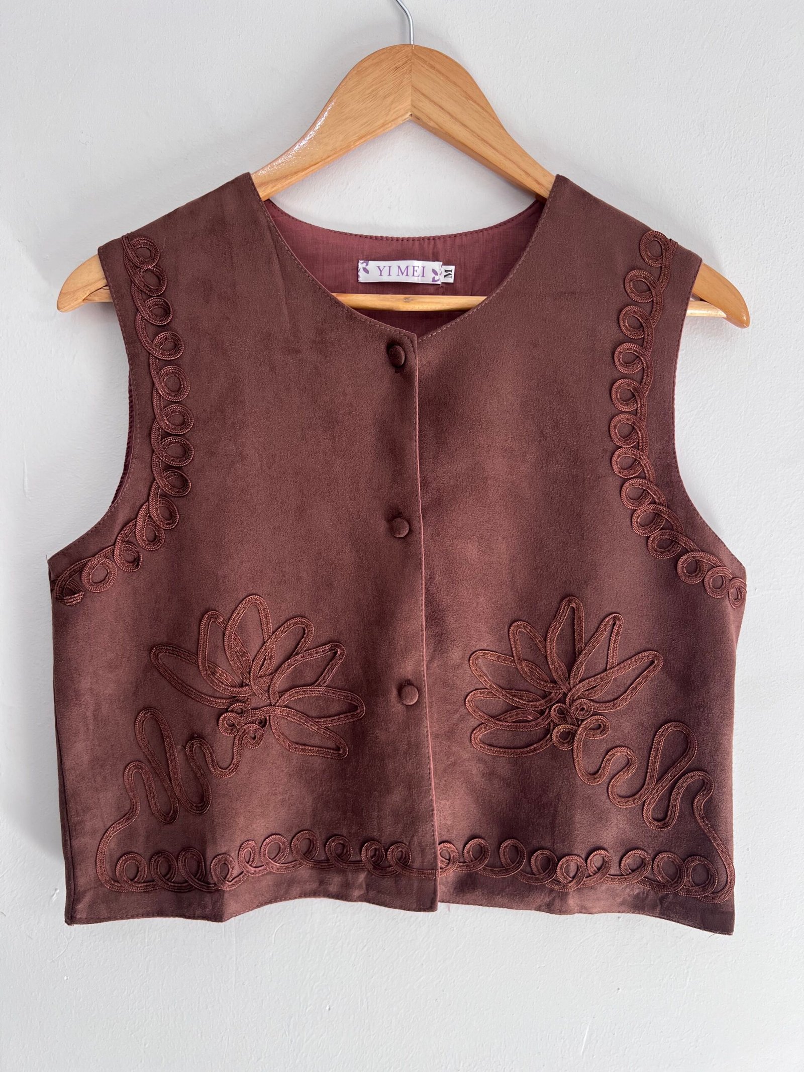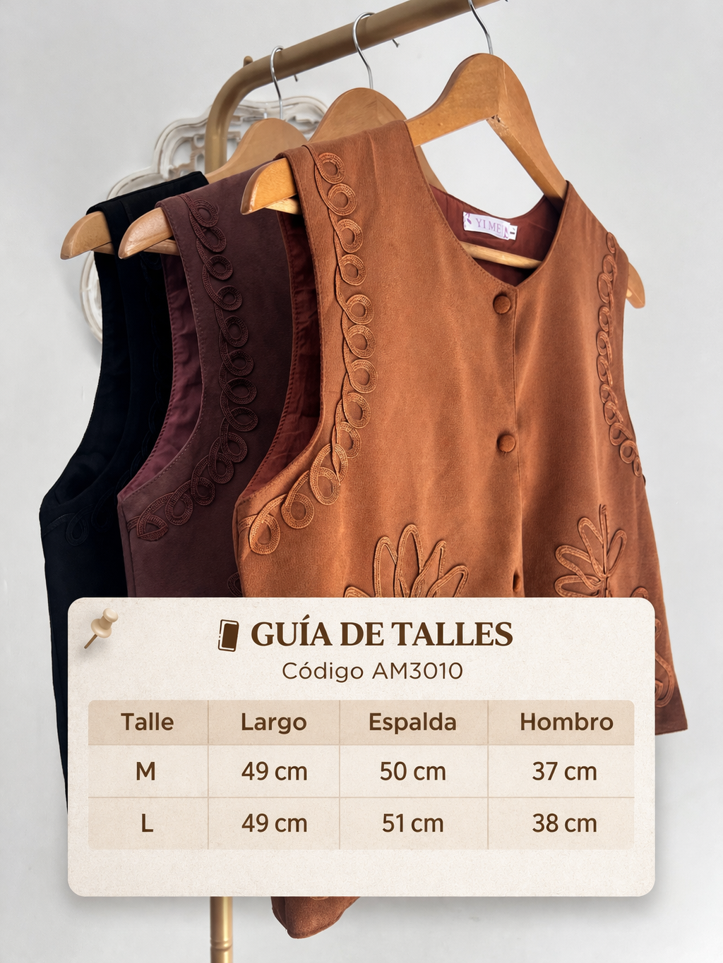 Chaleco boho elegante ✨ en tela tipo gamuza suave 🤎, con delicados bordados en relieve 🌿 que le dan un toque único.