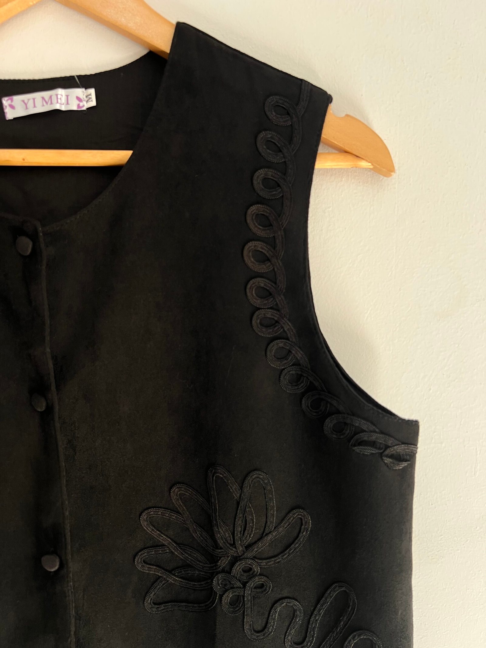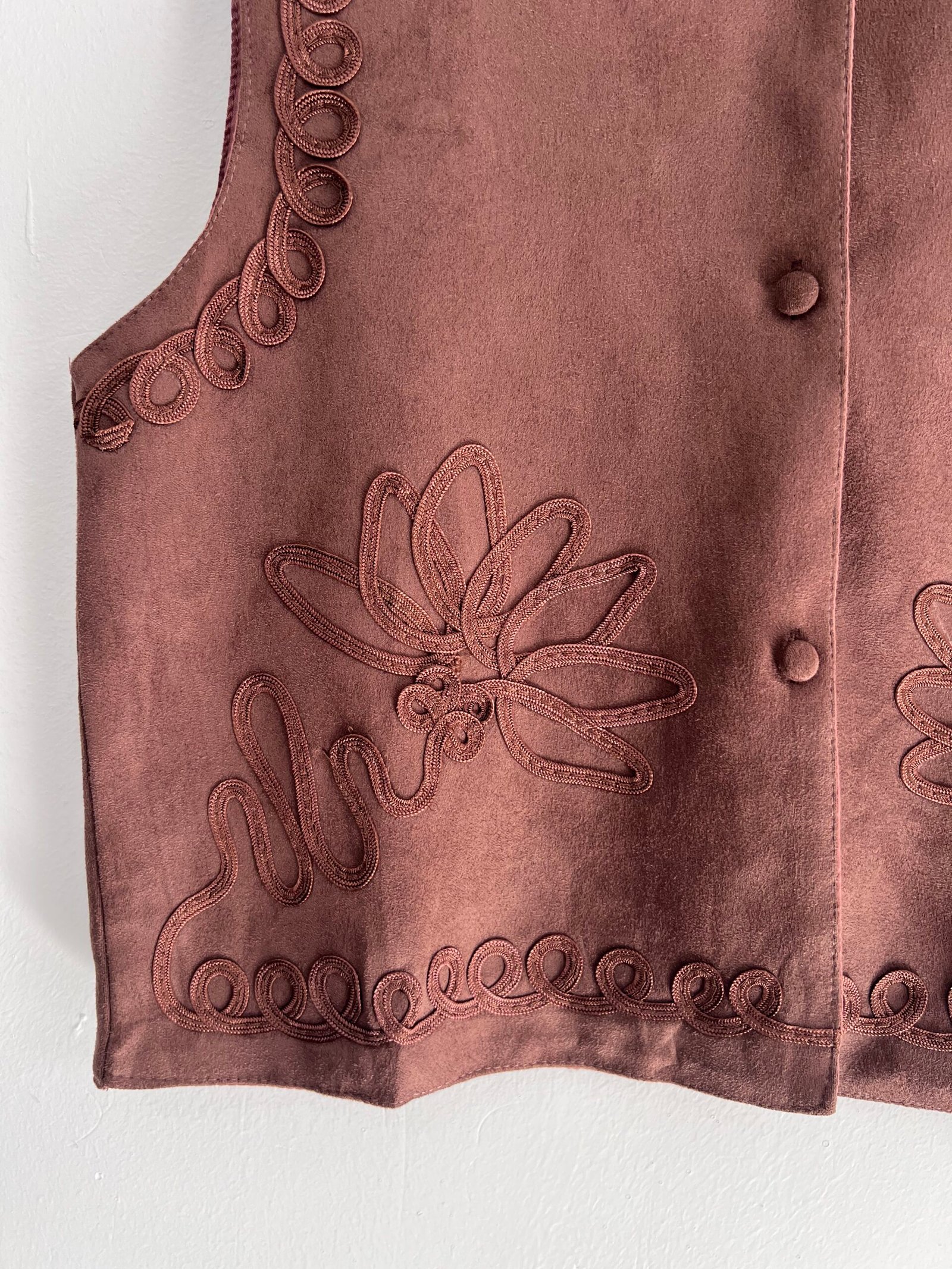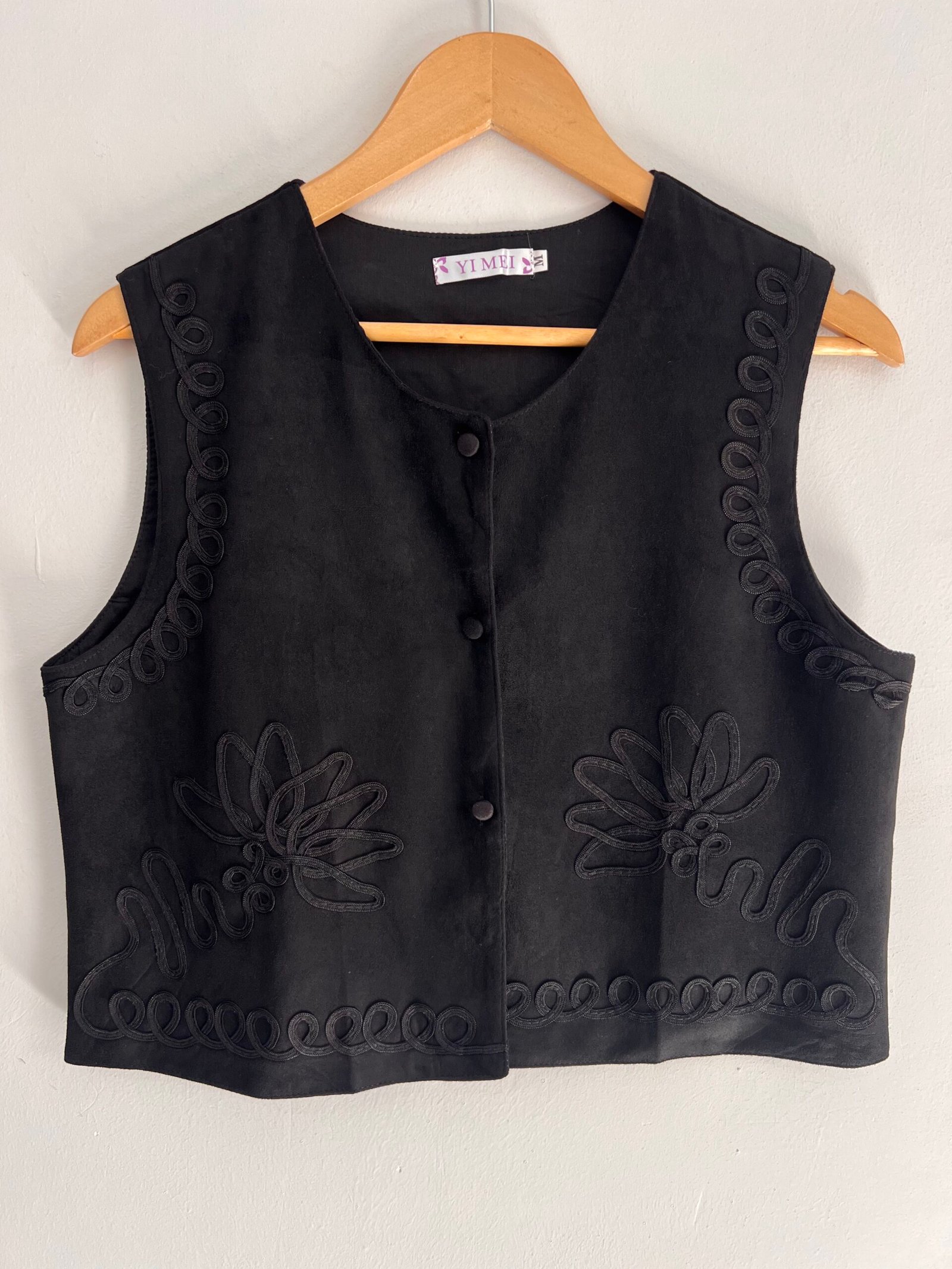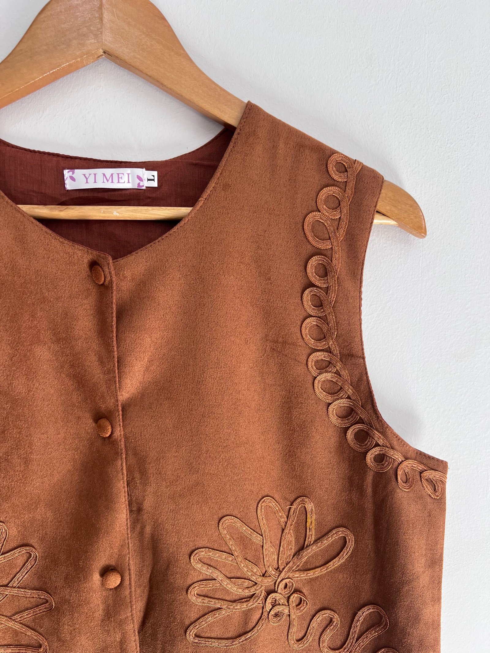 Chaleco boho elegante ✨ en tela tipo gamuza suave 🤎, con delicados bordados en relieve 🌿 que le dan un toque único.